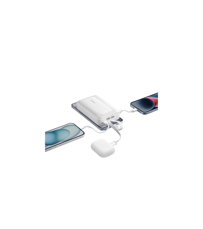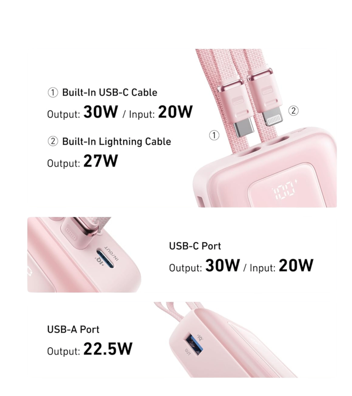 Stay powered on the go with the Anker Zolo 10K Power Bank, featuring dual built-in cables (MFi-certified Lightning and USB-C) tested to withstand 10,000 bends for rugged durability. Delivering 30W high-speed charging, it fuels an iPhone 15 to 58% or a Samsung S24 to 53% in just 30 minutes, minimizing downtime. The compact 10,000mAh design (7.65 oz) offers 2 full iPhone 15 charges and easily slips into your bag, while its versatile setup—built-in cables, USB-C port, and USB-A port—powers up to 4 devices simultaneously. Perfect for travelers and multi-device users, it combines portability with power, backed by an 18-month warranty and Anker’s reliable customer service. Adventure-ready and hassle-free, it’s your ultimate charging companion.