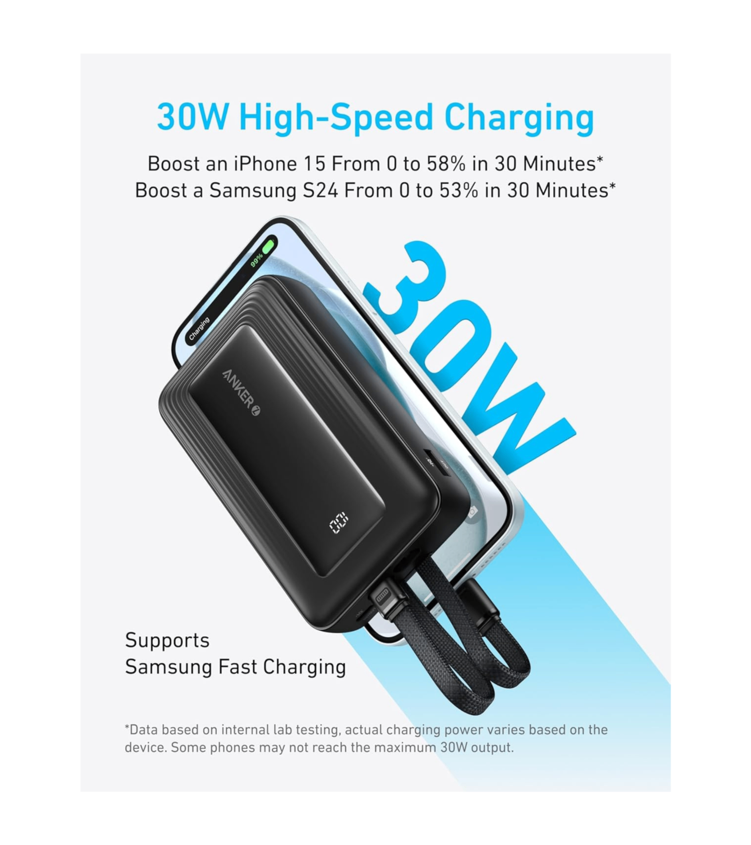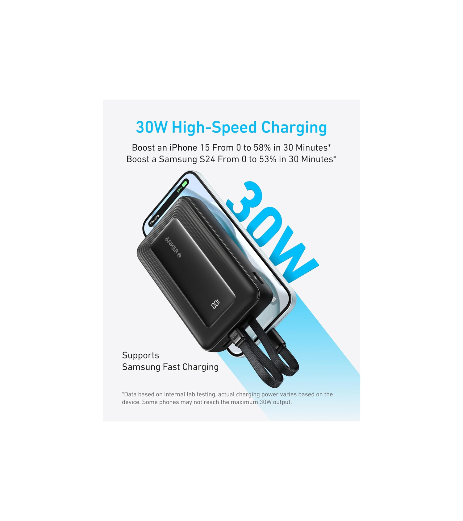 • 30W High-Speed Charging: Enjoy more time on the go without waiting around for your devices to charge with 30W power. Boost an iPhone 15 to 58% or a Samsung S24 to 53% in just 30 minutes.