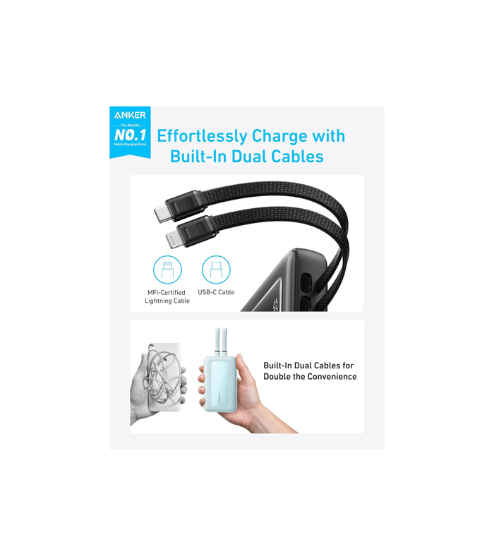 • Dual Cables Built-In: Charge effortlessly with dual built-in cables, including an MFi-certified Lightning cable and a USB-C cable. These cables are tested to last over 10,000 bends for long-lasting use.