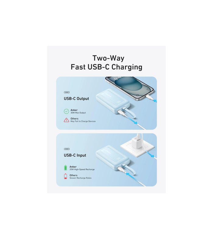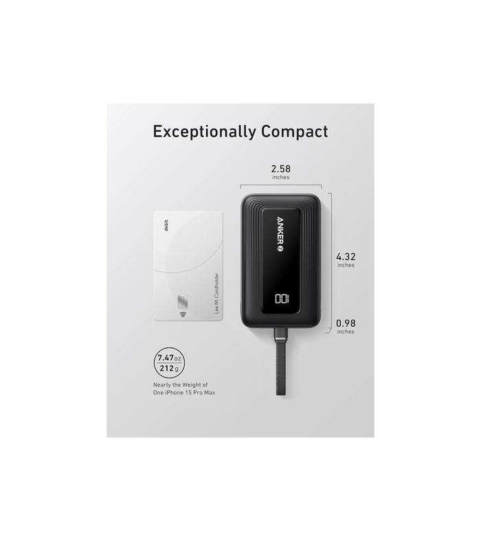 Stay powered on the go with the Anker Zolo 10K Power Bank, featuring dual built-in cables (MFi-certified Lightning and USB-C) tested to withstand 10,000 bends for rugged durability. Delivering 30W high-speed charging, it fuels an iPhone 15 to 58% or a Samsung S24 to 53% in just 30 minutes, minimizing downtime. The compact 10,000mAh design (7.65 oz) offers 2 full iPhone 15 charges and easily slips into your bag, while its versatile setup—built-in cables, USB-C port, and USB-A port—powers up to 4 devices simultaneously. Perfect for travelers and multi-device users, it combines portability with power, backed by an 18-month warranty and Anker’s reliable customer service. Adventure-ready and hassle-free, it’s your ultimate charging companion.