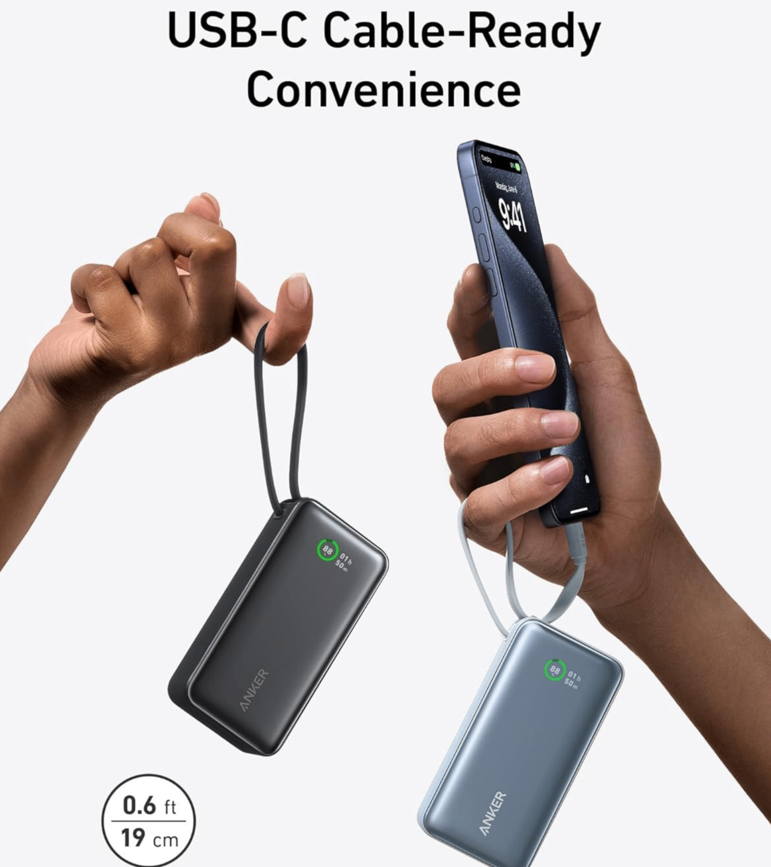 • Integrated Cable: Features a built-in USB-C cable for charging phones, tablets, laptops, and for recharging the power bank itself.