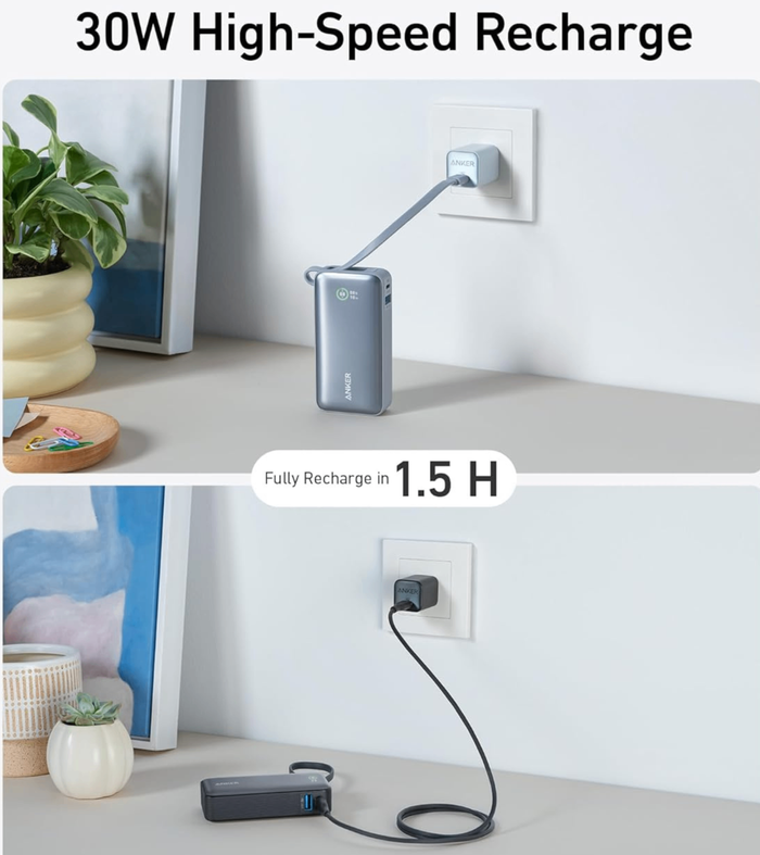 • Rapid Charging: Offers 30W bi-directional fast charging, allowing the power bank to reach 50% in 45 minutes or an iPhone 14 to 50% in 30 minutes.