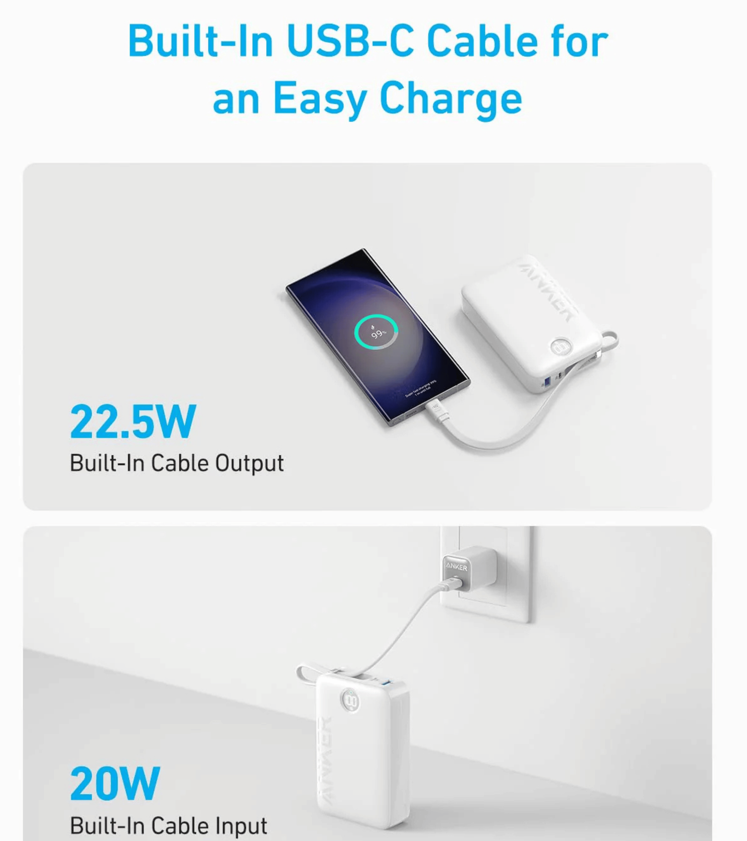 What You Get: Anker Power Bank (20,000mAh, 22.5W, Built-In USB-C Cable), welcome guide, our worry-free 18-month warranty, and friendly customer service. Note: The built-in cable supports both charging and recharging; additional cables are not included.