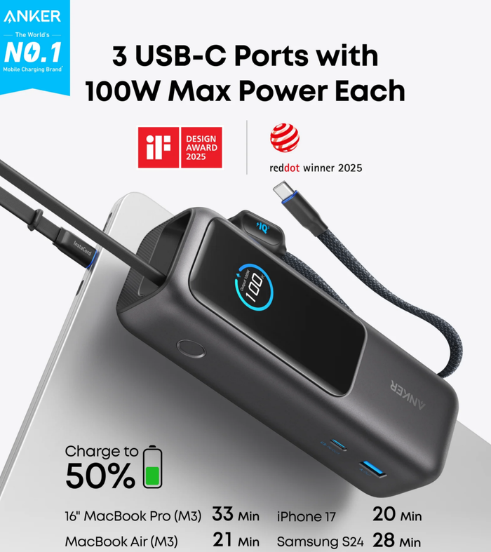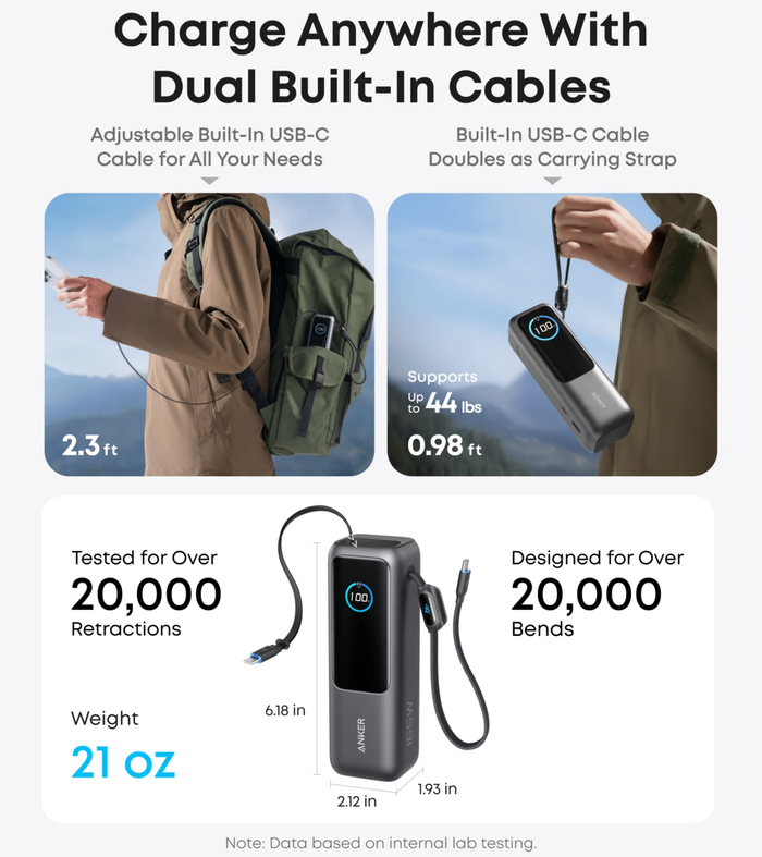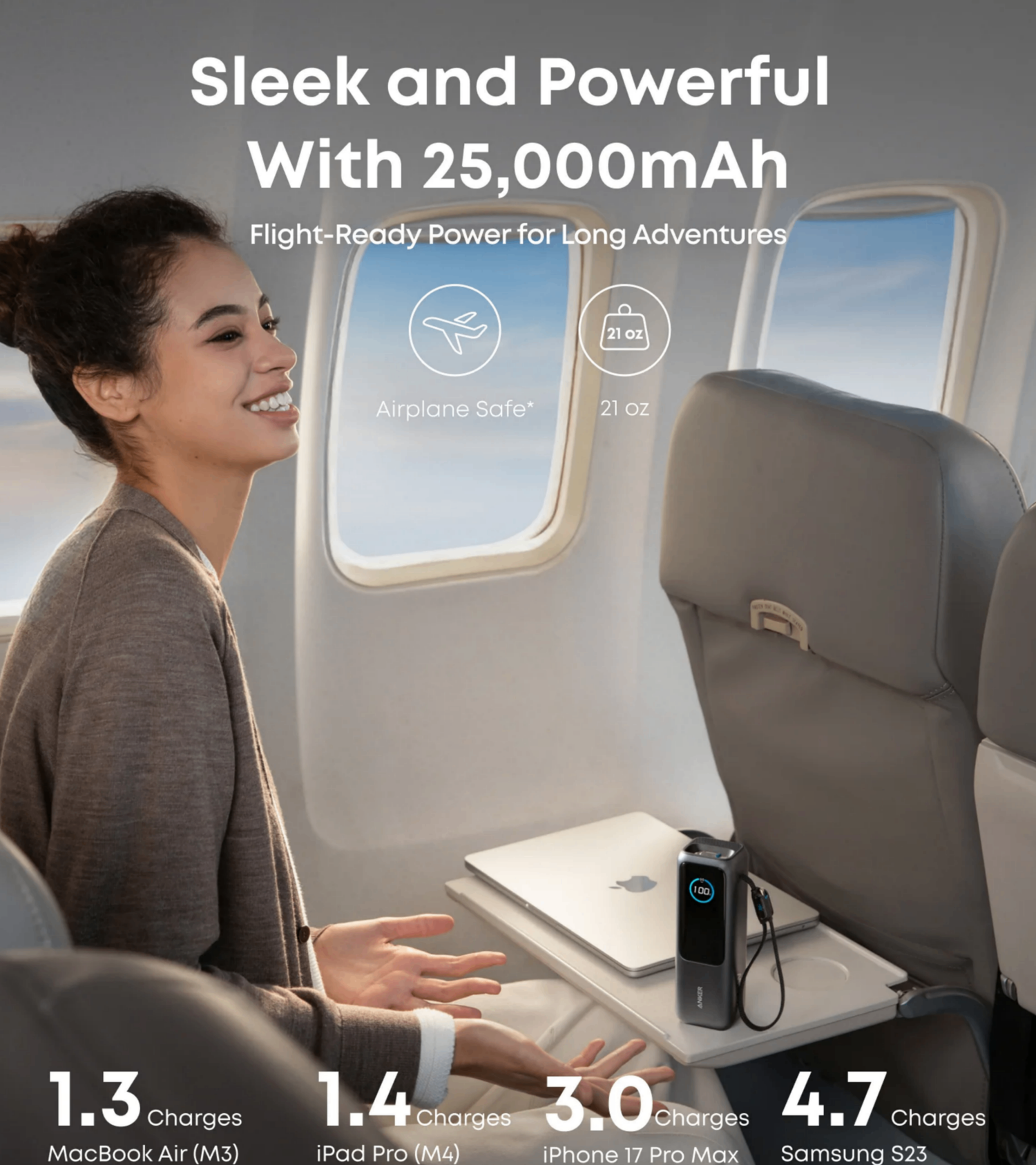 Anker Power Bank (25K, 165W, Built-In and Retractable Cables)