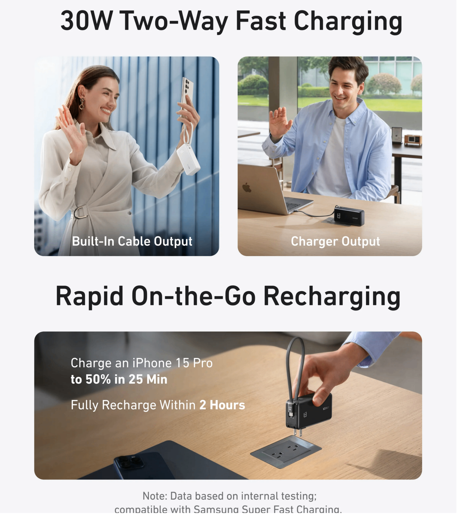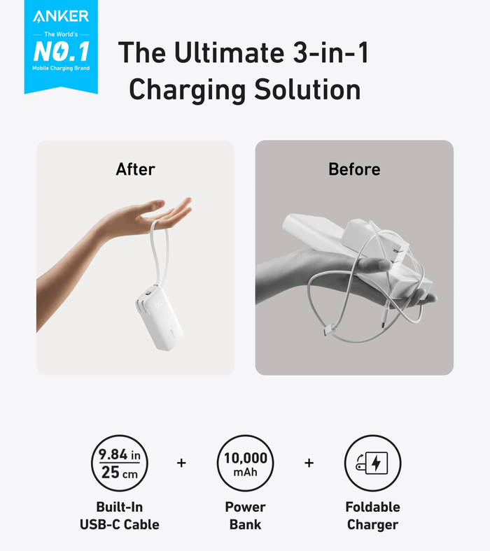 Model NumberA1637Your 3-in-1 Power SolutionDiscover the ultimate charging convenience with a device that combines a power bank, AC plug, and a 0.82 ft built-in cable that also serves as a carrying strap. Enjoy 30W fast charging alongside a handy digital display.30W Quick Power BoostExperience the speed of 30W fast charging and recharging, perfect for keeping your devices powered throughout the day.Long-Lasting USB-C CableThe USB-C cable is built for the long haul, featuring a 10,000+ bend lifespan for dependable charging.1 Cable for All USB-C DevicesDesigned for compatibility across devices, the built-in cable provides up to 30W of power, simplifying your charging routine. Note: This power bank is compatible with selected laptops; older iPhone models require a Lightning cable (not included).NoteThis power bank is compatible with selected laptops; older iPhone models require a Lightning cable (not included).