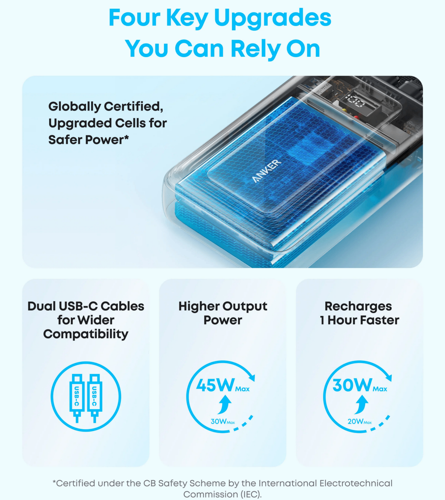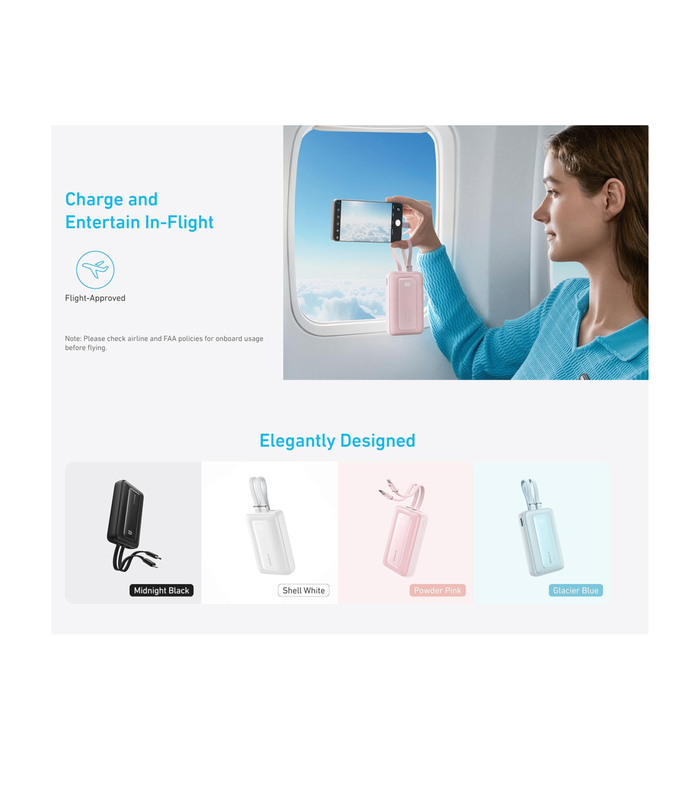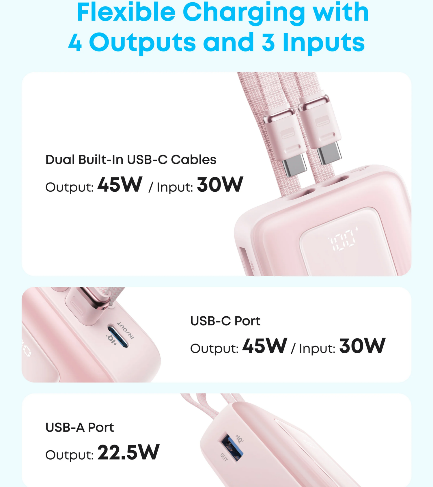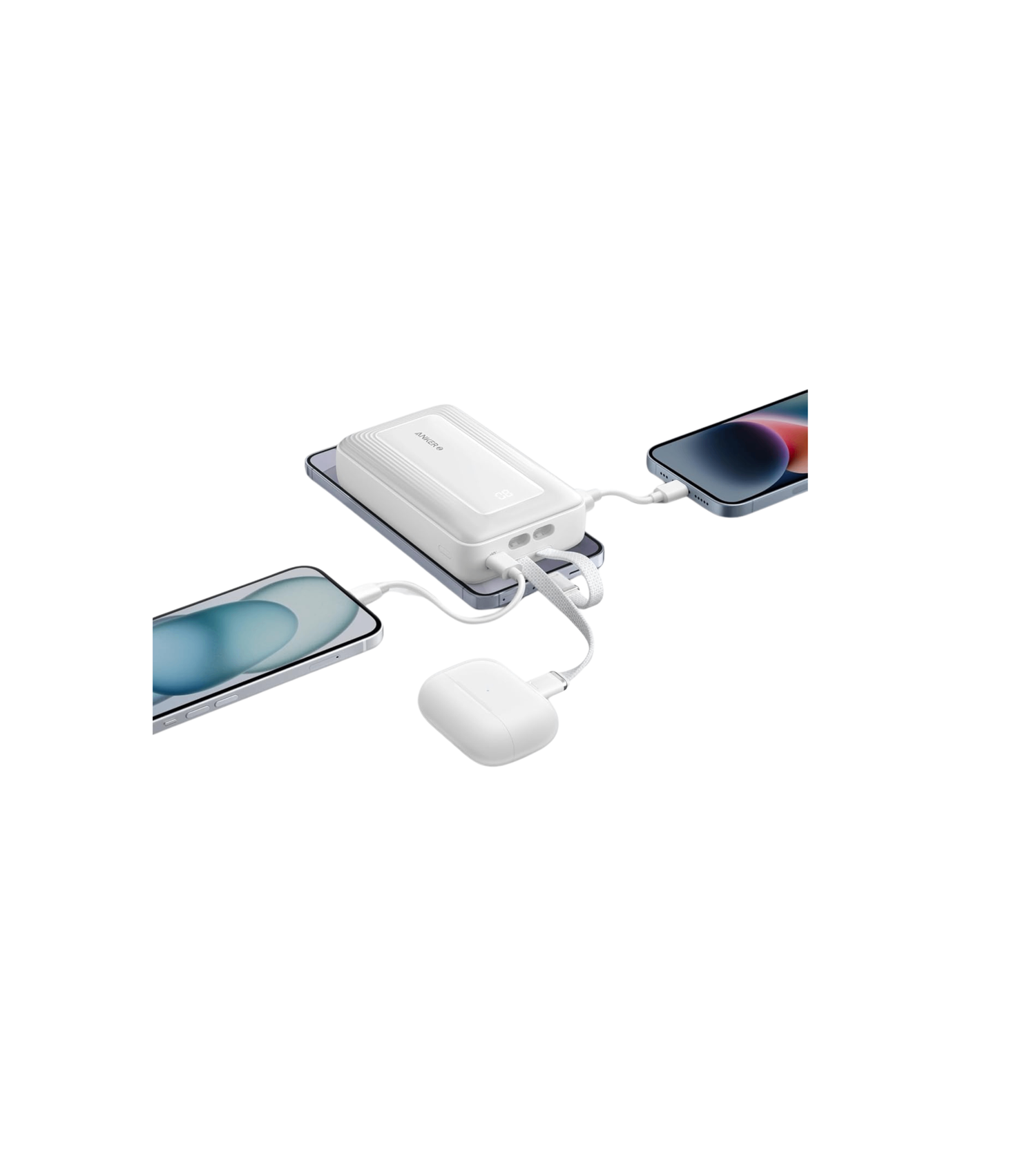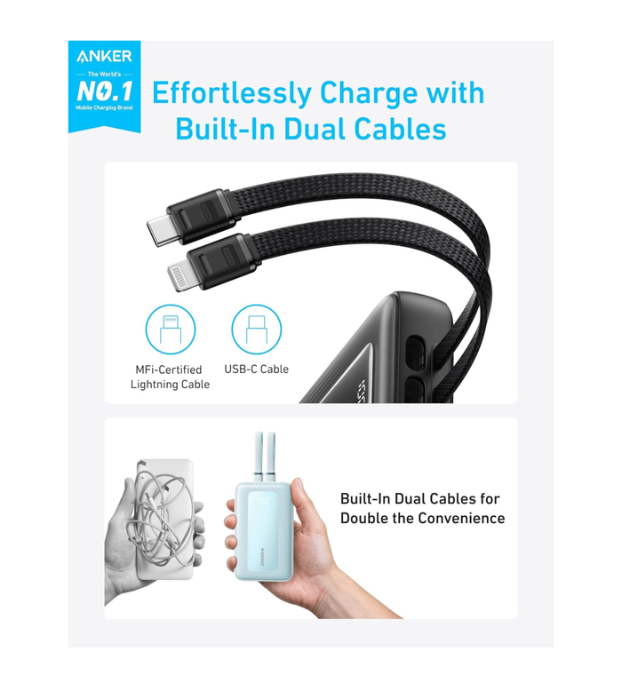 tay powered on the go with the Anker Zolo 10K Power Bank, featuring dual built-in cables (MFi-certified Lightning and USB-C) tested to withstand 10,000 bends for rugged durability. Delivering 30W high-speed charging, it fuels an iPhone 15 to 58% or a Samsung S24 to 53% in just 30 minutes, minimizing downtime. The compact 10,000mAh design (7.65 oz) offers 2 full iPhone 15 charges and easily slips into your bag, while its versatile setup—built-in cables, USB-C port, and USB-A port—powers up to 4 devices simultaneously. Perfect for travelers and multi-device users, it combines portability with power, backed by an 18-month warranty and Anker’s reliable customer service. Adventure-ready and hassle-free, it’s your ultimate charging companion.