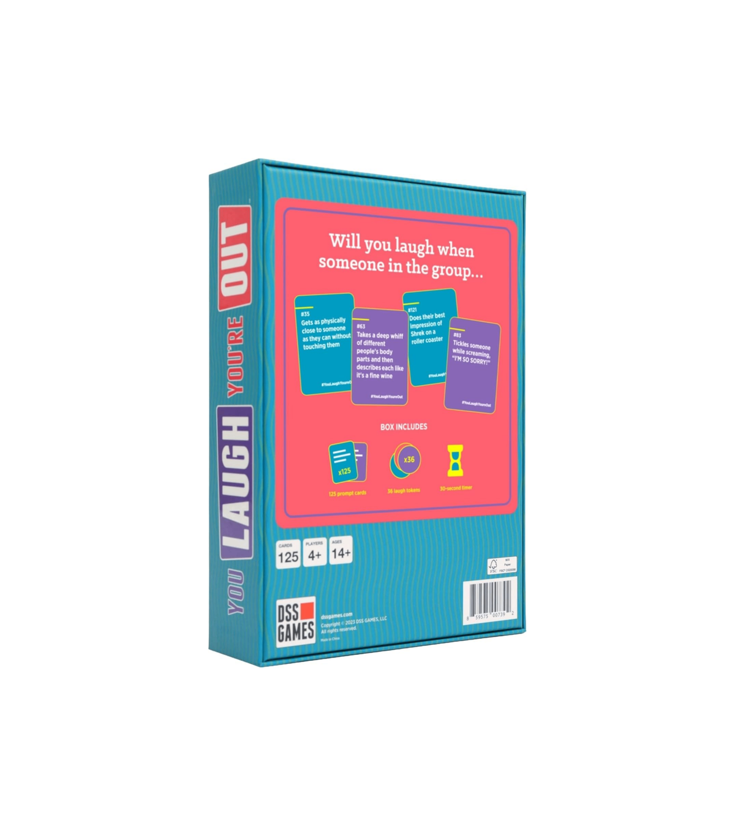 Includes 125 prompt cards, 36 laugh tokens, and 1 sand timer