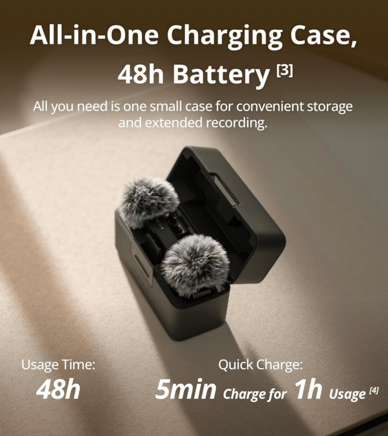 Extended Battery, More Recording Time - Mic Mini wireless lavalier microphone with Charging Case offers up to 48 hours of battery life, [3] ideal for long trips, interviews, livestreaming and other intensive usage scenarios.