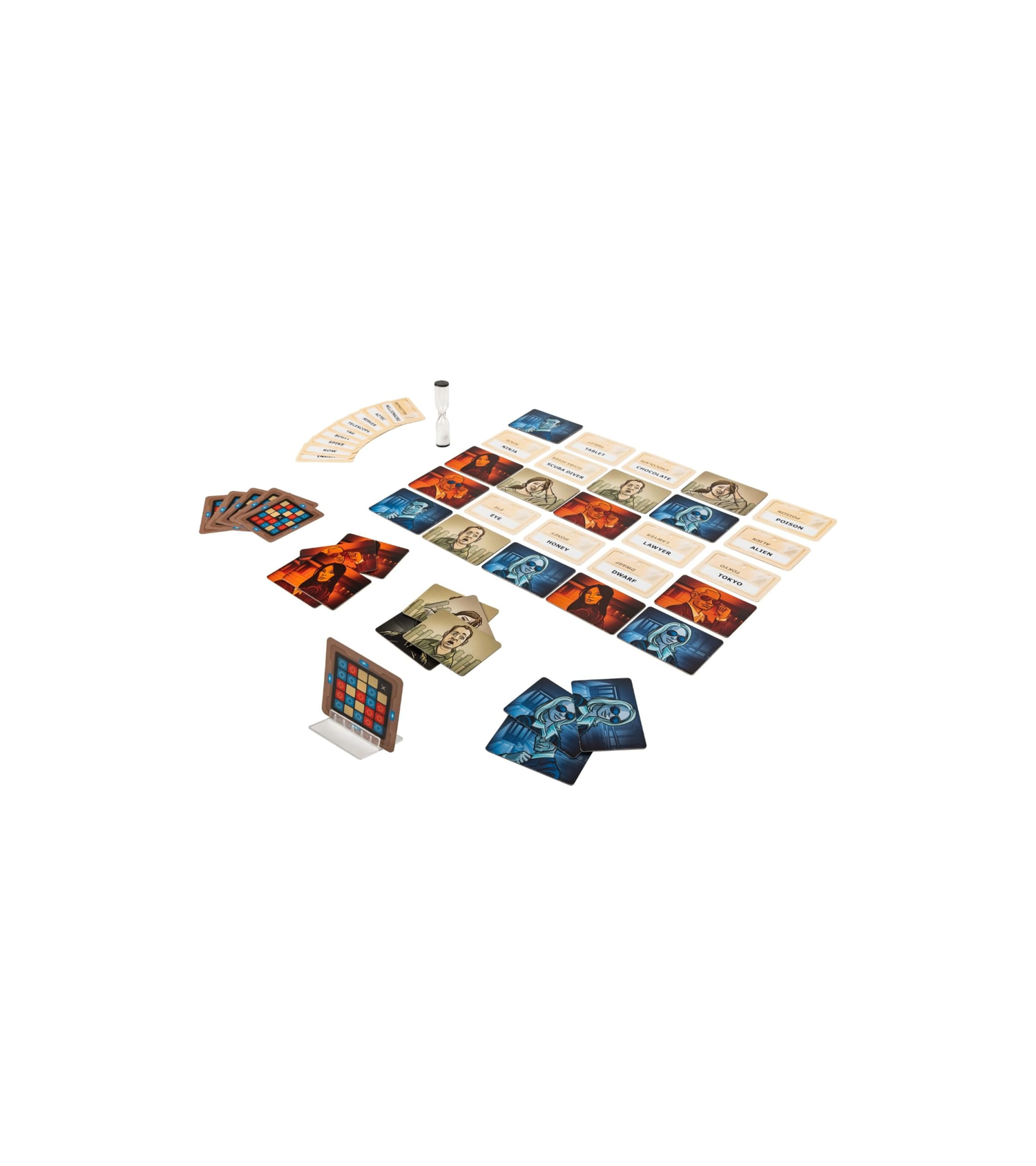 Includes: 16 agent cards in two colors, 1 double agent card, 7 innocent bystander cards, 1 assassin card, 40 key cards, 1 rulebook, 1 card stand, 1 timer, and 200 cards with 400 codenames.